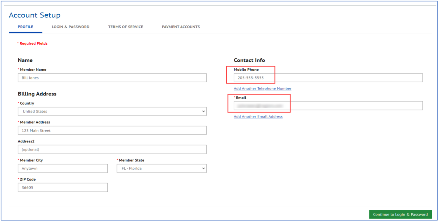 3. On the Profile tab enter your Mobile Phone number (optional) and Email Address (required)