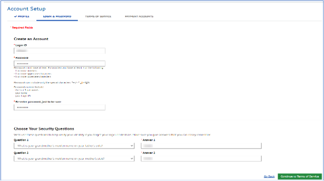 4. On the Login & Password tab, enter a Login ID and Password and then answer two security questions