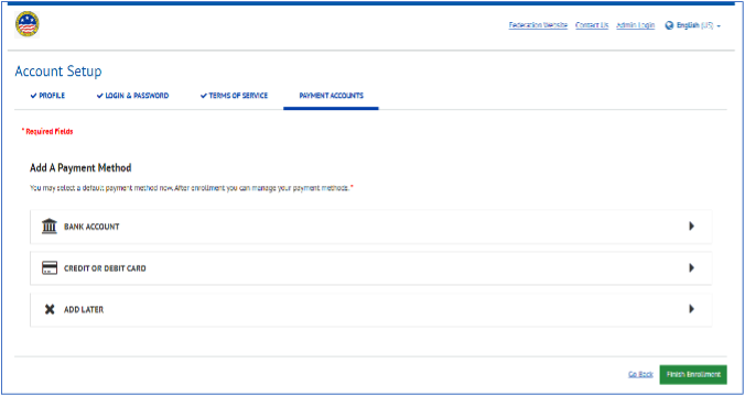 6. On the Payment Accounts tab, choose which payment method you would like to use for your Membership payment, a bank account or a credit or debit card.