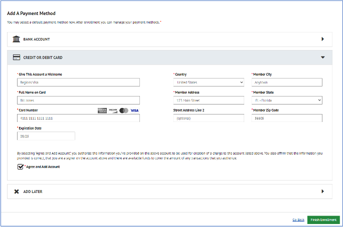 • In the first box, give the Card account a nickname (for example, Regions VISA)